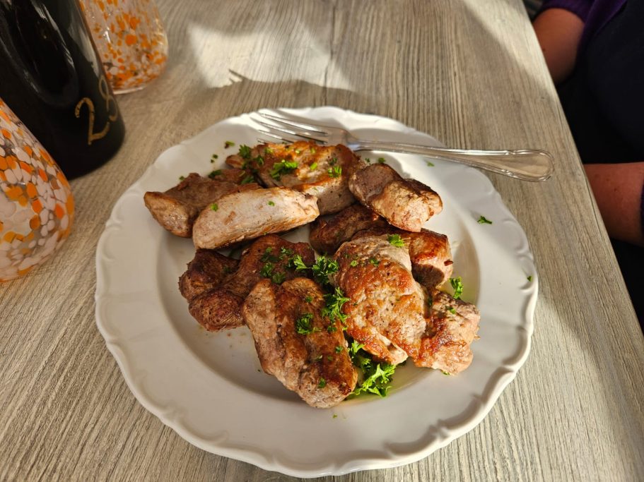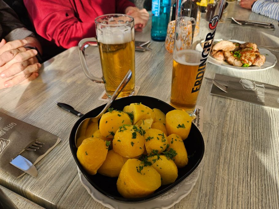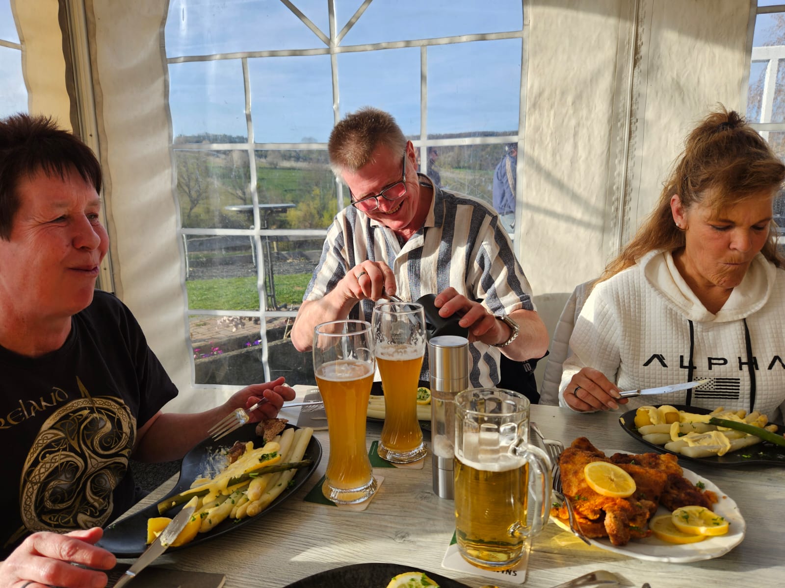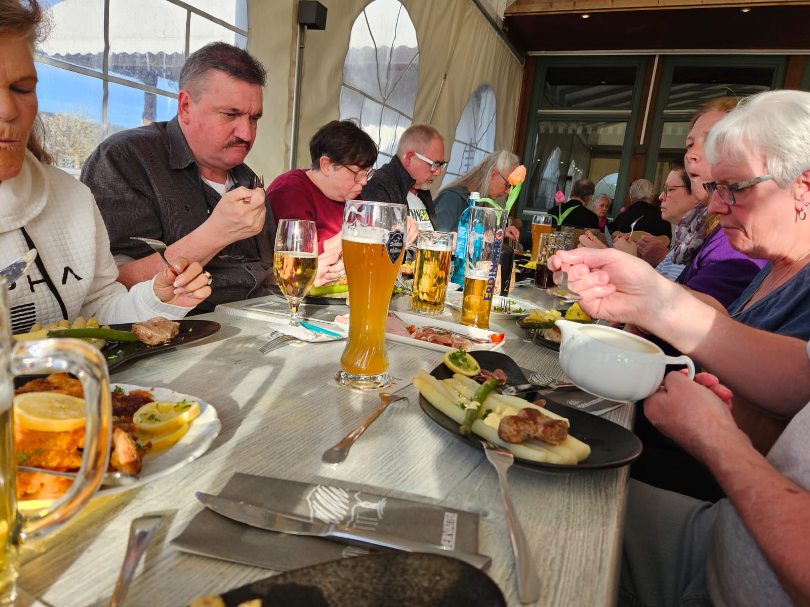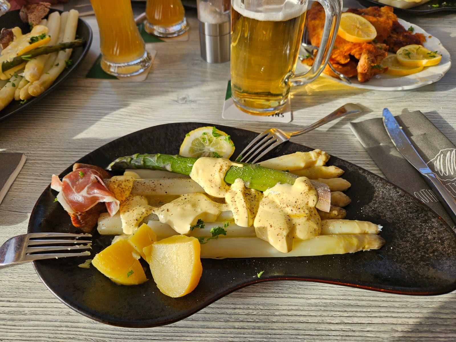 Wir bekamen eine Vorsuppe, Spargel, Schnitzel, Schweinelendchen, sowie Kartoffeln und Sauce Hollandaise serviert. Abgerundet wurde das Ganze noch mit einer Schinkenplatte.