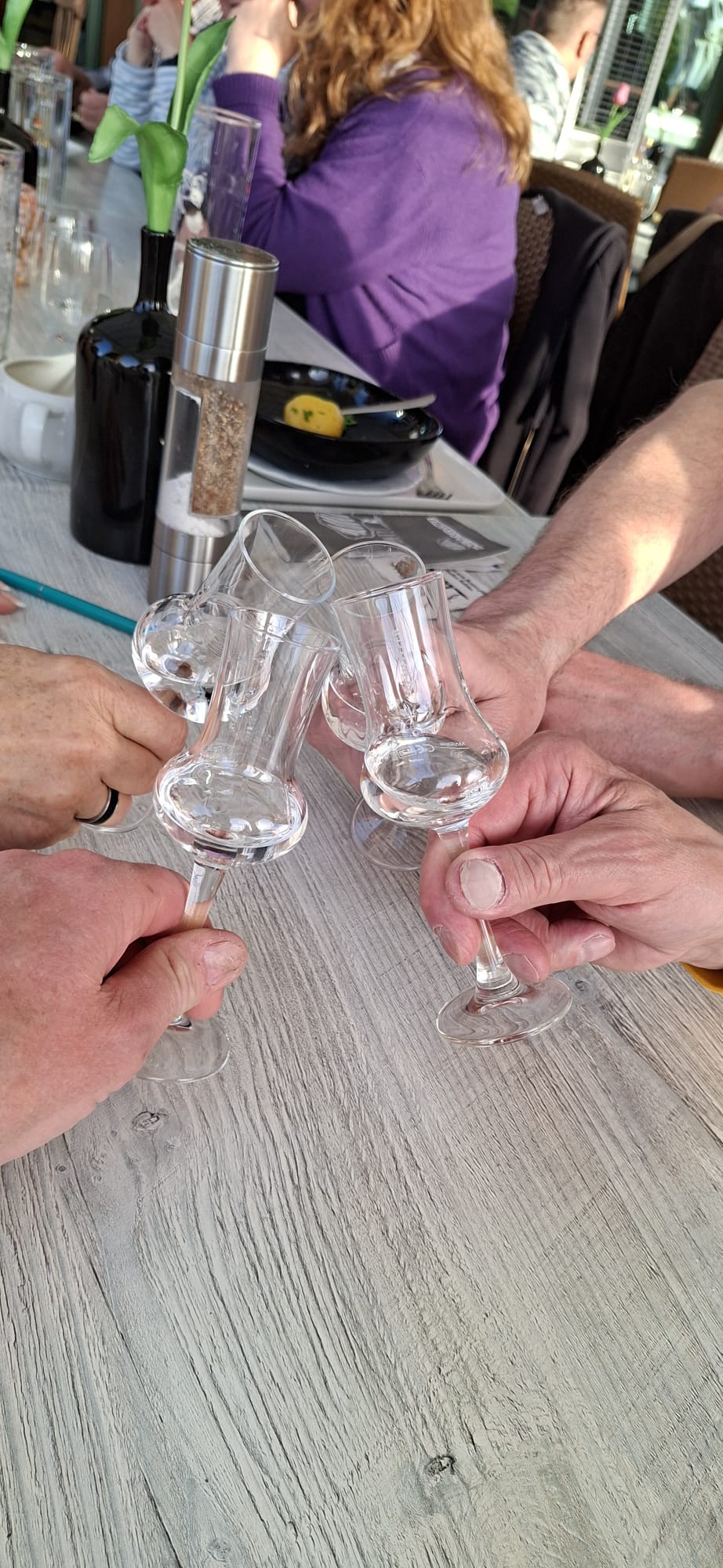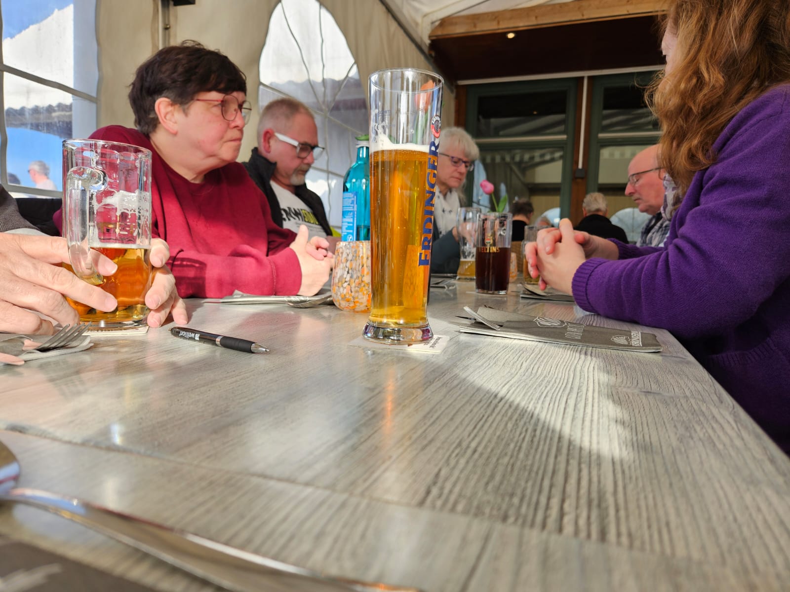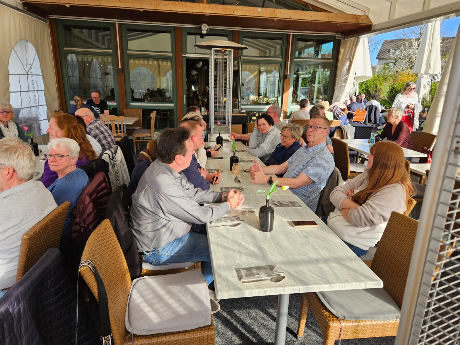 Bei perfektem Wetter mit strahlendem Sonnenschein, genossen wir noch einige Zeit auf der Außenterrasse und den angrenzenden Bereichen, bevor wir dann unserer Plätze an der reservierten Tischen einnahmen.