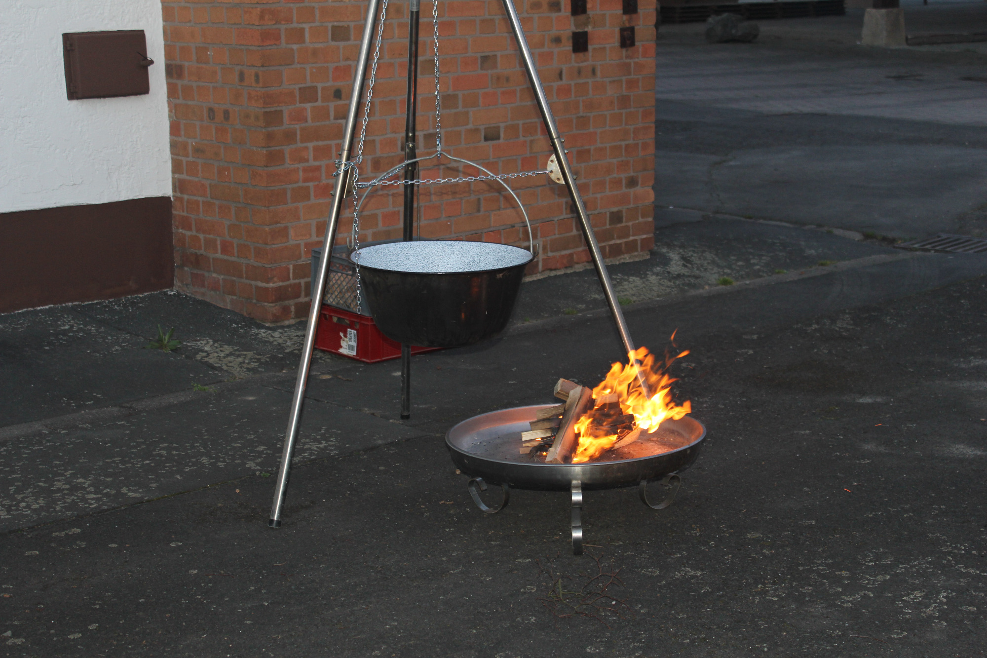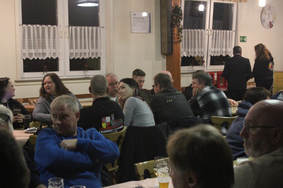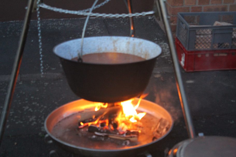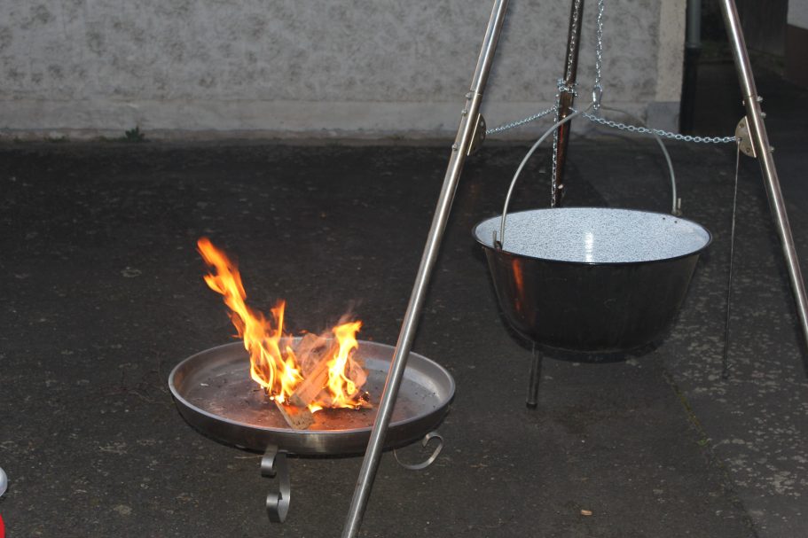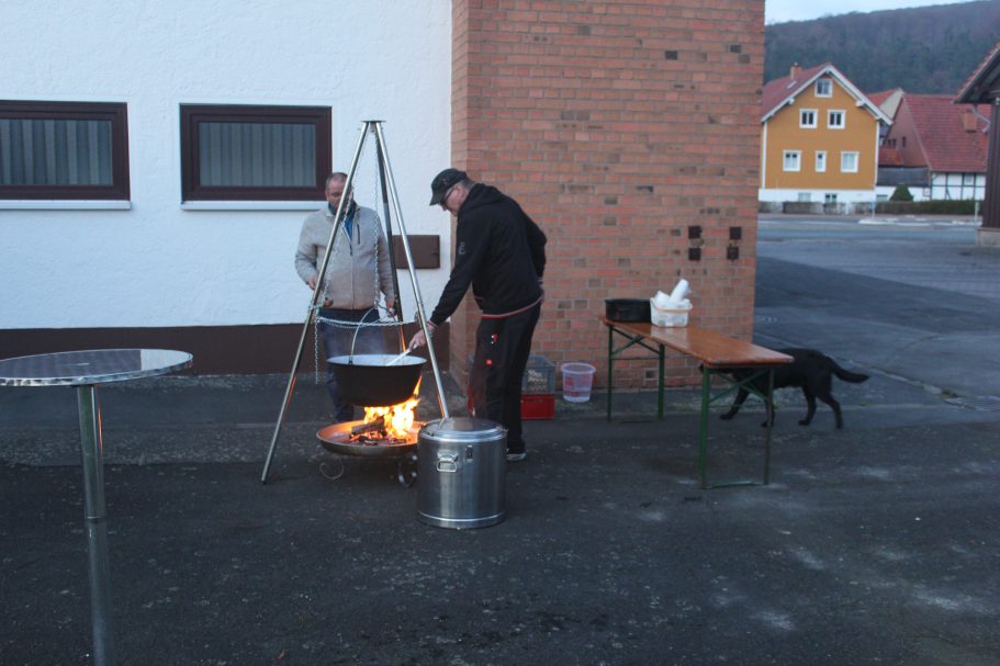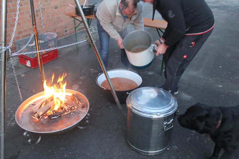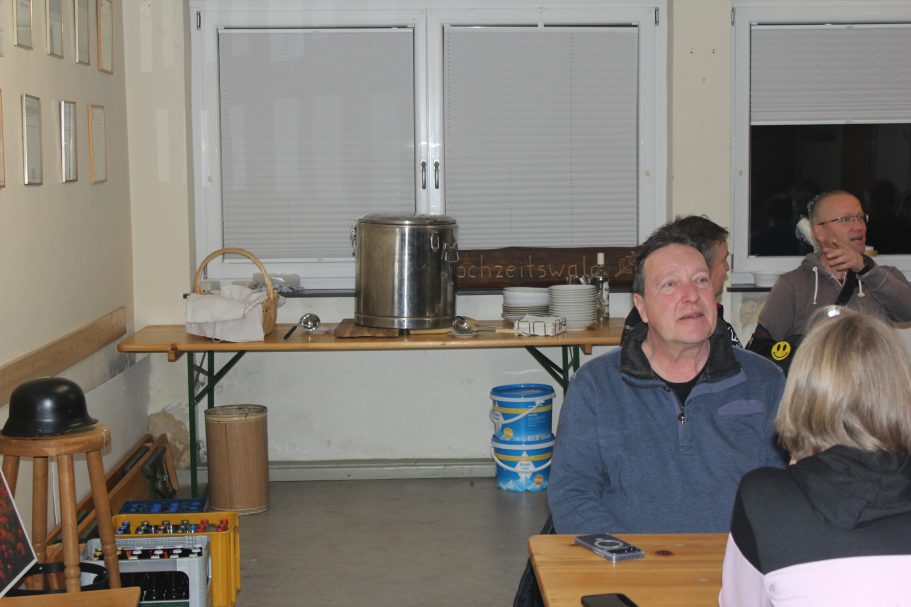 Am Freitag wurde diese dann auf dem Dreibein-Schwenkgrill von Rolf erwärmt. Da das Wetter noch nicht zum draußen sitzen war, hatten wir den großen Raum im Gerätehaus für die Gäste vorbereitet. Trotz diverser anderen Termine im Ort, hatten sich fast 30 Personen angemeldet. Nachdem Rolf die Begrüßung gemacht hatte, wurde die Suppe ausgegeben. Jeder hatte in großes Lob an die Köchin für die leckere Suppe. So das von den 28 Liter nur noch ein sehr kleiner Rest am Ende des Abends vorhanden war.