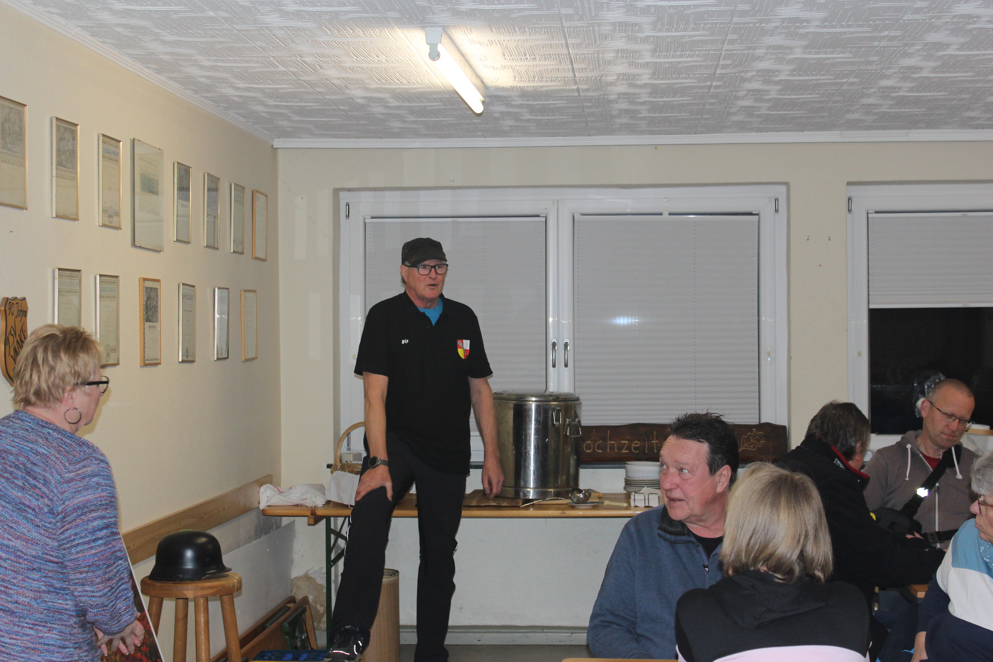 20 Mitglieder konnten von Rolf im Gerätehaus begrüsst werden. ( Knut und Anja konnten diesen Abend leider nicht dabei sein. ) Nachdem rustikalen Buffet ( kleine Frikadellen, Gehacktes, Stracke, Gemüse, Käseplatte und Brot & Brötchen ) großen Anklang fand, ging es zum gemütlichen Teil des Abends über.