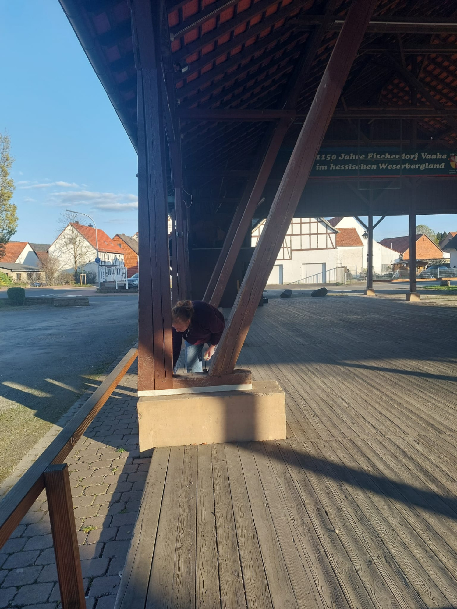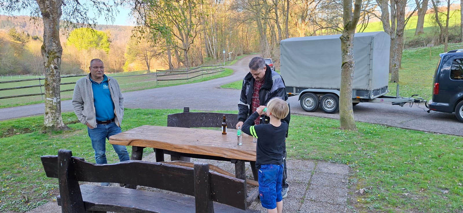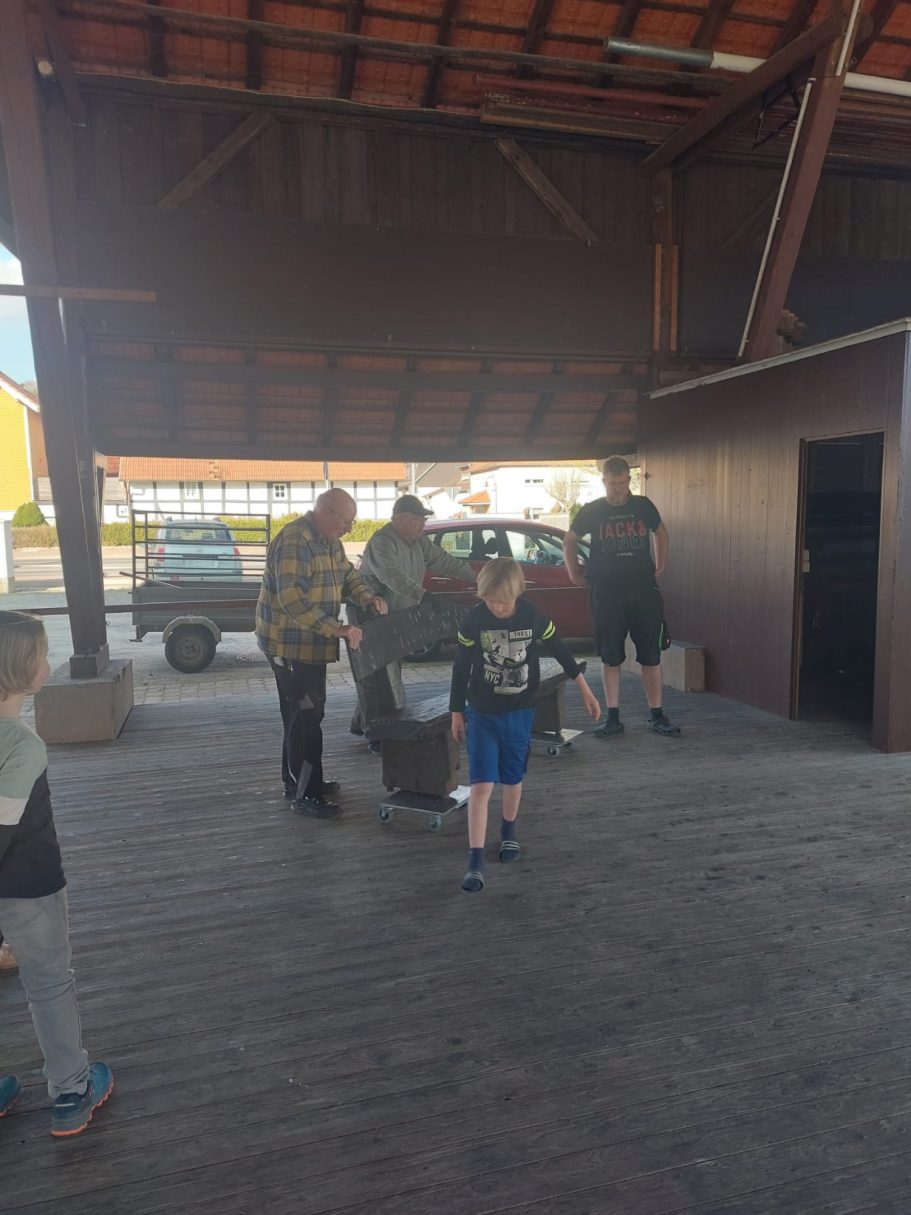 an diesem Abend sollten eigentlich nur Schönsheitsarbeiten am Dreschschuppen gemacht werden. Geplant war, das die Betonfundamente ein neuen Farbanstrich bekommen sollte. Da aber so schönes Wetter war und einige starke Männer anwesend waren, wurde kurze Hand beschlossen, dass die Sitzgruppe und die Schaukel aus dem Winterschlaf befreit werden sollte und an ihrem Platz am Hochzeitswald gebracht werden sollte.